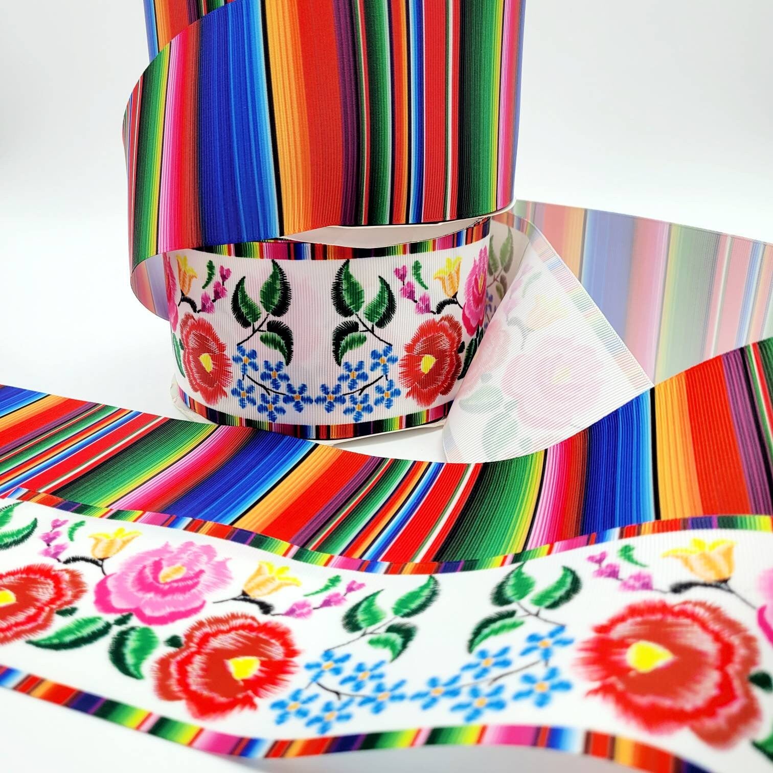 Grosgrain Ribbon perfect for hairbows & crafts. Wire free, Beautiful Mexican Floral Print. Bright Serape Print Ribbon